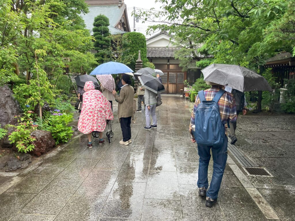 同朋の会の「ぶらり親鸞」に参加させていただき、有意義かつ楽しい一日となりました。雨ではありましたが暑すぎず、葛飾区四ツ木地区と宝町を歩き、東京にもこのような道があると初めて知りました。細く曲がっていて途中で消えたり、角度が微妙な三叉路だったりと。