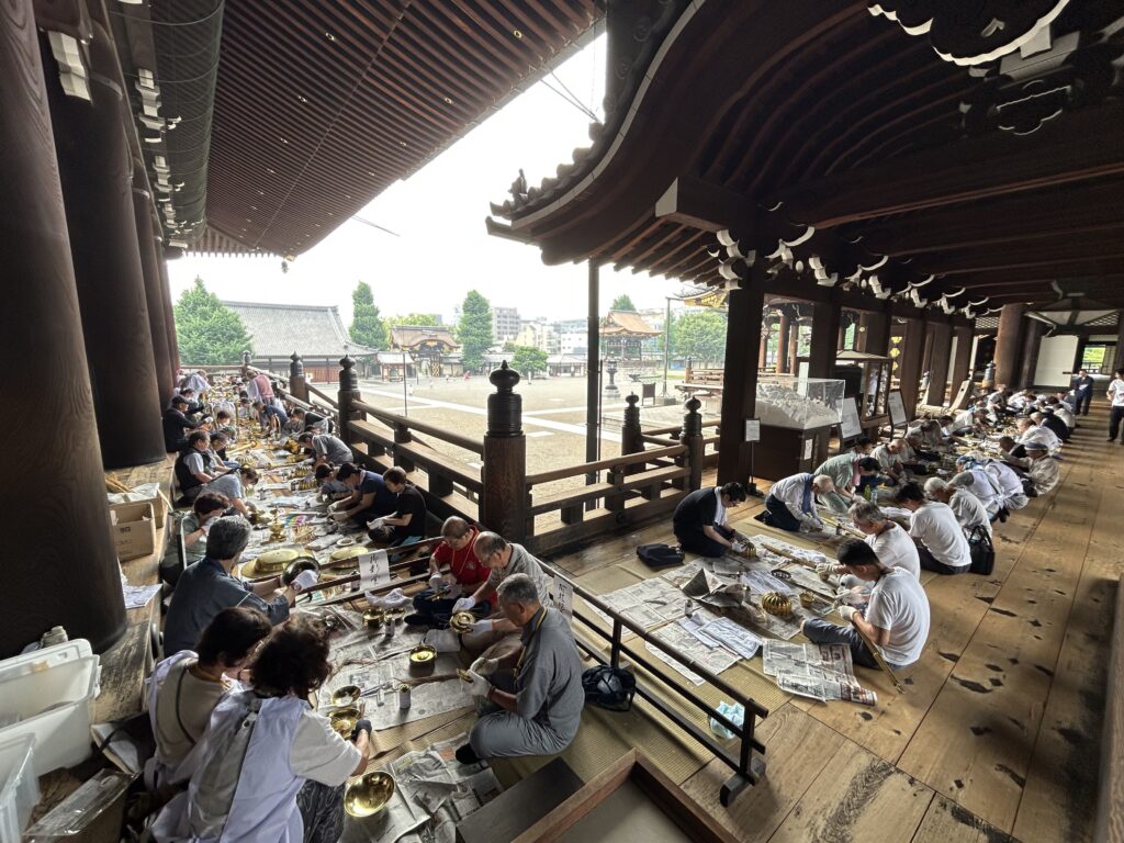 7月1日から3日間、僧侶1人を含む同朋の会9人の皆さんと共に真宗本廟おみがき奉仕団に参加いたしました。朝夕の勤行が日程に組まれ、中日の午前、阿弥陀堂と御影堂の渡り廊下周辺で、他の団体の皆さんと一緒にわらでお道具をみがきました。猛暑の中でしたが、幸運なことにその時間だけは日が陰り、拙いながらも無事おみがきに勤しむことができました。